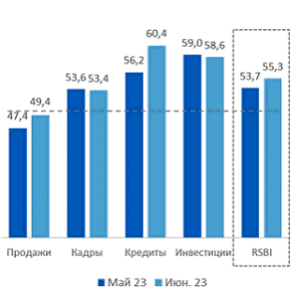 Высокие показатели деловой активности в июне были обусловлены в основном восстановлением компоненты Продаж, которая приблизилась к нейтральной зоне, и не менее убедительным ростом компоненты Кредиты, также продемонстрировавшей рекордные показатели. Компоненты Кадры и Инвестиции находились в зоне уверенного роста и поддержали выход Индекса RSBI на исторические максимумы.