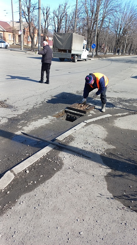 Плановые работы идут по улицам Калинина, Доватора и на проспекте Коста. Сотрудники ВМБУ «Домоуправление» вскрывают и обследуют каждый колодец.