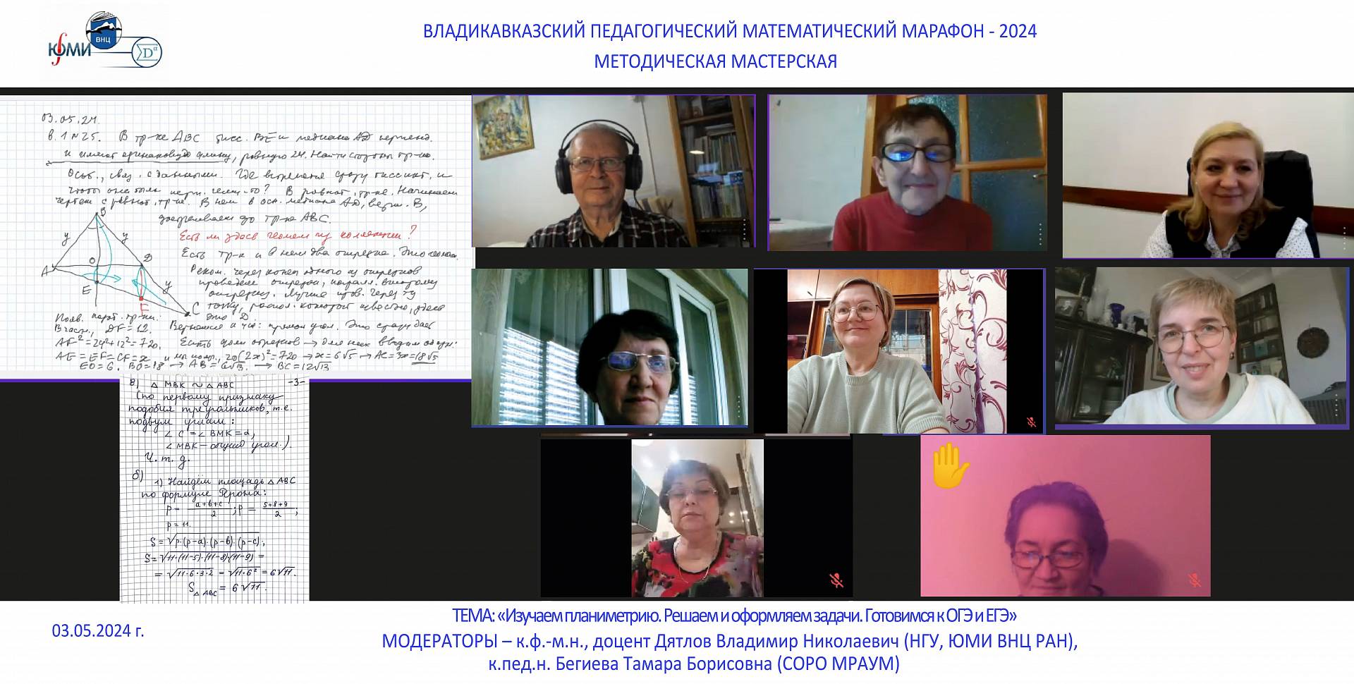 В пятницу, 03 мая 2024 г., в онлайн формате состоялась Методическая мастерская, проводимая в рамках совместного с СОРИПКРО и СОРО МРАУМ научно-образовательного проекта «Владикавказский педагогический математический марафон - 2024» на тему «Изучаем планиметрию. Решаем и оформляем задачи. Готовимся к ОГЭ и ЕГЭ».