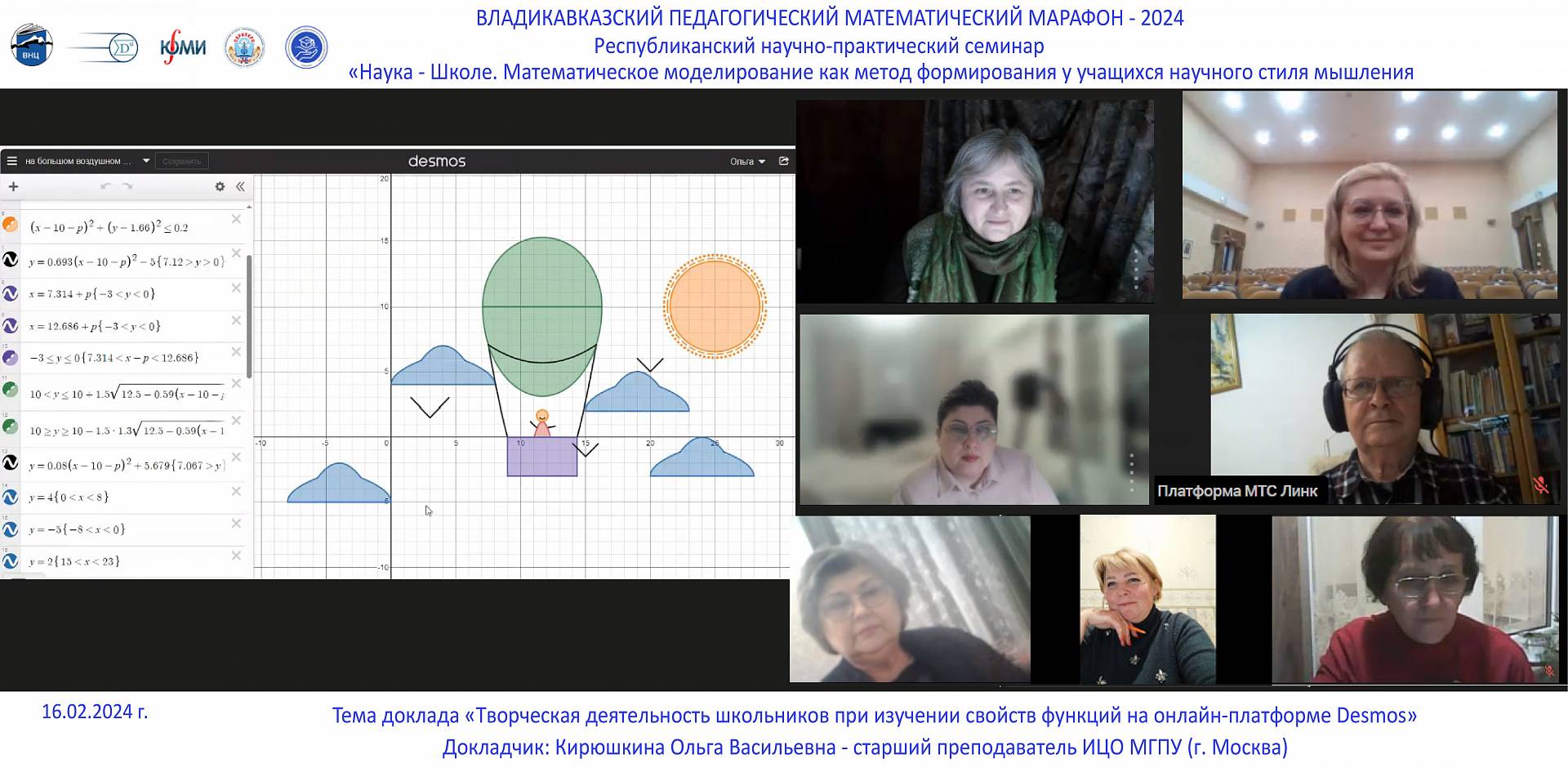 В ходе доклада Кирюшкина О.В. представила методику организации творческой деятельности учащихся на онлайн-платформе «Desmos» на примере изучения преобразований графиков функций. Были выделены основные инструменты платформы «Desmos», представлены особенности выполнения творческих заданий в этой среде и конкретные примеры творческих работ школьников и студентов с элементами анимации разных уровней подготовки – «новичок», «мастер», «эксперт». Автор доклада подчеркнула, что несмотря, на то, что наиболее востребованными виртуальными математическими лабораториями при обучении математики являются программы «Геогебра» и «Математический конструктор», компьютерная среда «Desmos», как онлайн графический калькулятор, имеет ряд преимуществ: простоту использования, полный бесплатный функционал, большие возможности визуализации алгебраических объектов, в частности, функций, посредством их графиков. О.В. Кирюшкина отметила, что в данной среде используется функционально-графический подход при изучении алгебры, при этом функция рассматривается как объект и, одновременно, средство формирования функциональной грамотности при решении практико-ориентированных задач. Автором доклада было представлено учебно-методическое сопровождение работы в среде «Desmos», включая банк различных графиков функций и авторских текстовых сюжетных задач, а также представлен канал «Мультиматика» на Рутубе, в котором размещаются все авторские материалы и творческие работы школьников и студентов, выполненные под руководством О.В.Кирюшкиной.