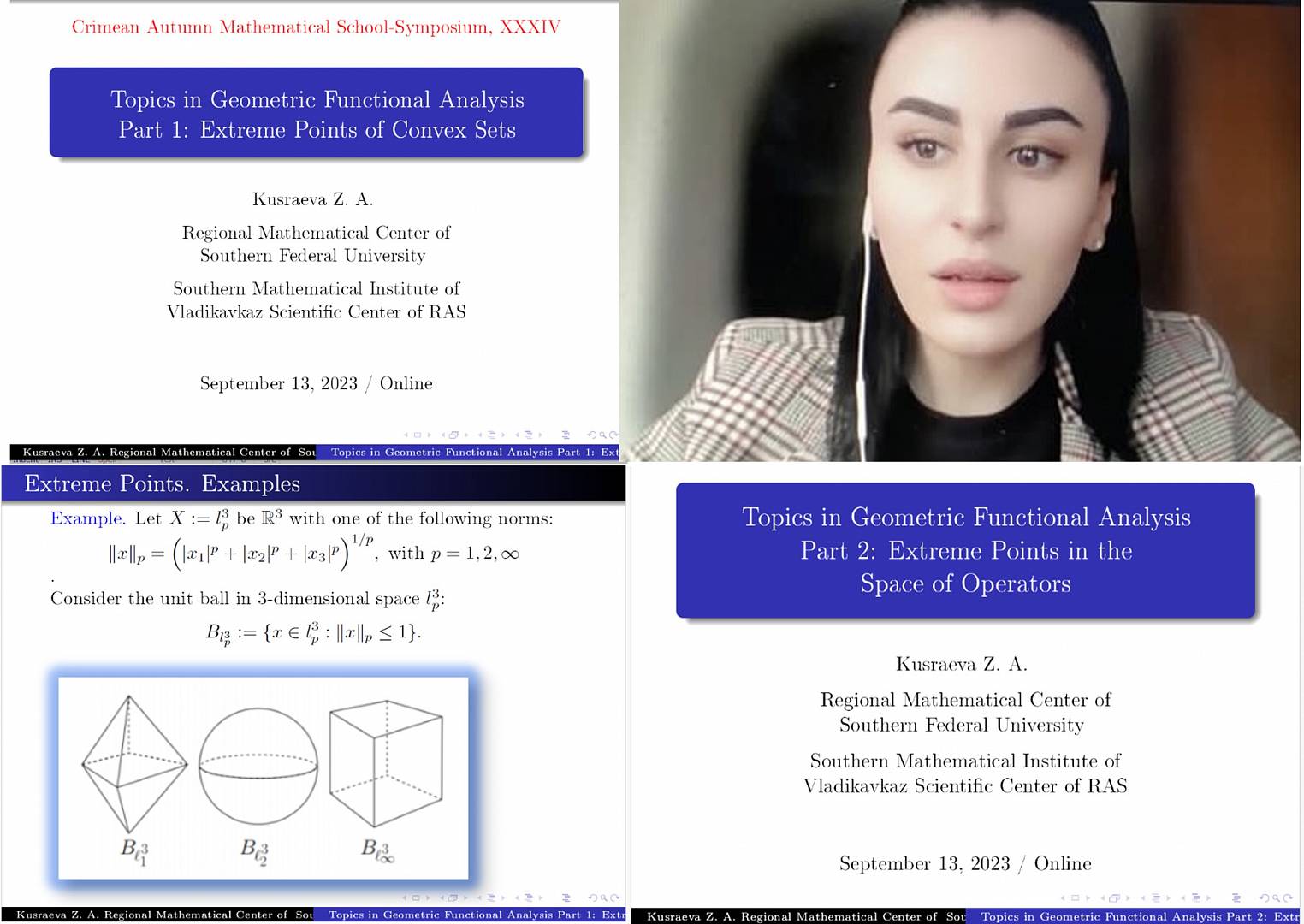 Залина Анатольевна представила вниманию слушателей обзорный цикл лекций на тему: «Topics in geometrical functional analysis», состоявший из двух лекций: «Extreme points of convex sets» и «Extreme points in the space of operators». В этом курсе Кусраева З.А. изложила идеи, касающиеся одного из разделов функционального анализа, в котором изучаются свойства пространств и операторов в них, зависящие от геометрического строения шаров и различных выпуклых множеств. Лектором был представлен обзор небольшого фрагмента геометрического функционального анализа, связанный с крайними точками. В первой части обзора были приведены простейшие сведения о выпуклости, крайних точках единичных шаров различных банаховых пространств, крайних лучах. Также были приведены классические теоремы Минковского, Крейна-Мильмана и Кли. Во второй части обзора автор изложил несколько не так давно полученных результатов о крайних точках пространства линейных операторов, после чего представил собственные совсем свежие результаты о крайних точках в пространстве однородных полиномов.