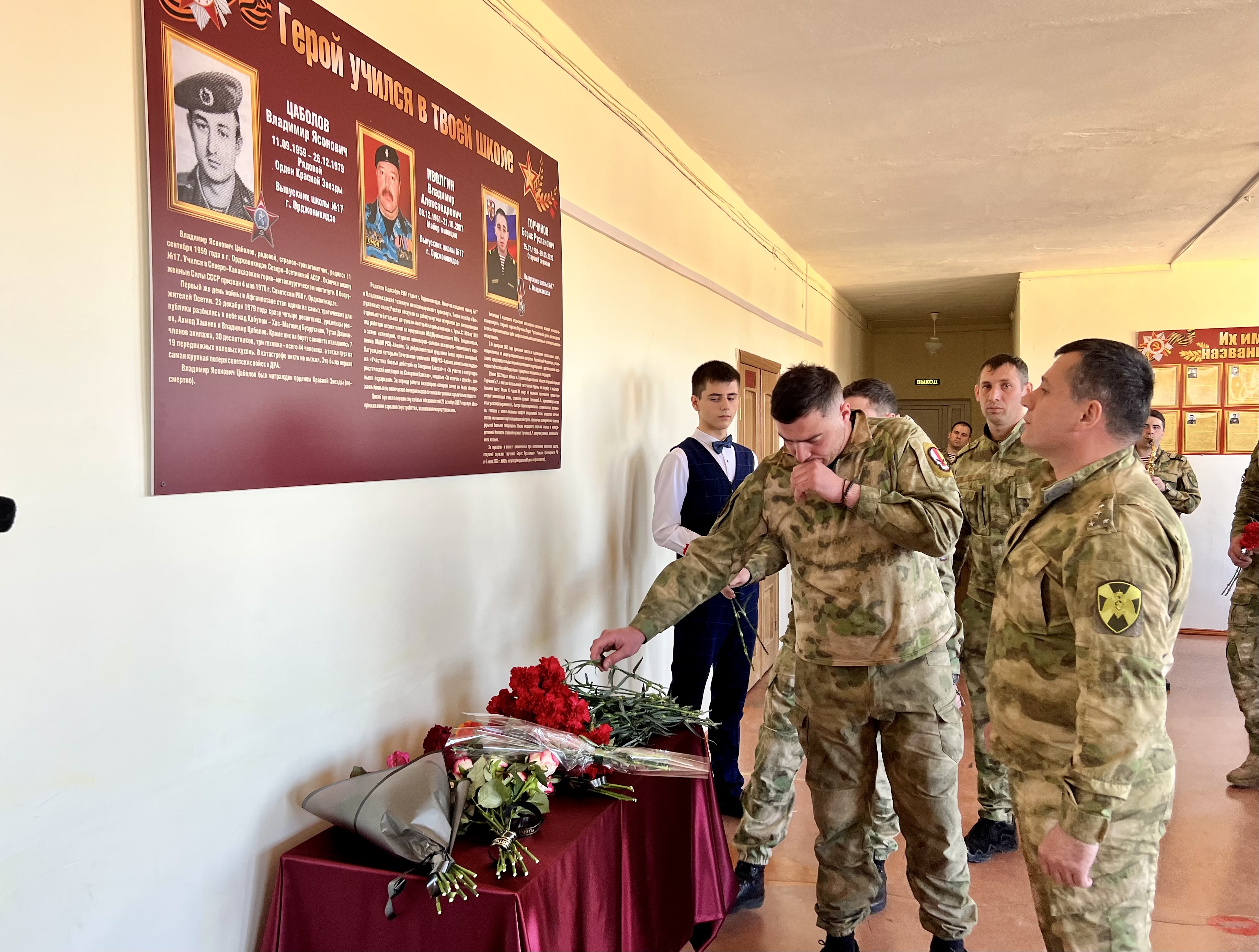 В школе №17 открыт памятный стенд выпускникам учебного заведения — сотруднику ОМОН «Ирбис» Управления Росгвардии по Республике Северная Осетия - Алания майору полиции Владимиру Иволгину,