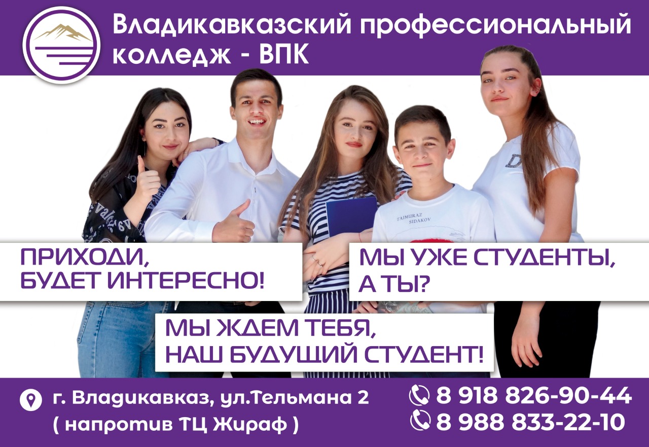 Владикавказский профессиональный колледж объявляет прием учащихся. Набор проводится по самым востребованным специальностям, таким как: землеустройство; экономика и бухгалтерский учет (по отраслям); операционная деятельность в логистике; банковское дело; правоохранительная деятельность; юриспруденция; право и организация социального обеспечения; туризм и гостеприимство.