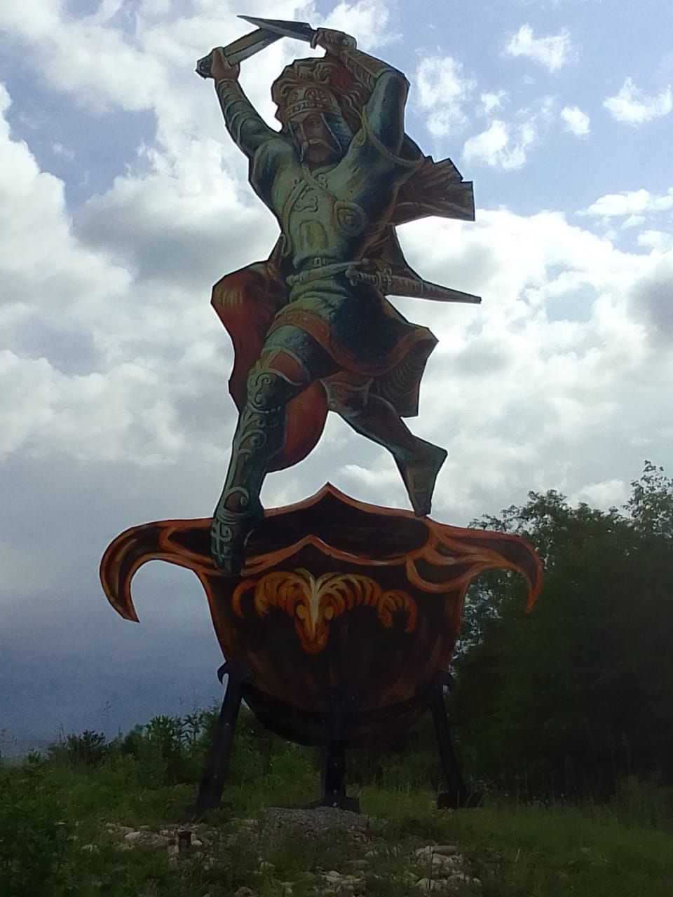 «Пятиметровая инсталляция выполнена из металла. Арт-объект стоит недалеко от святого места. Это сделано для того, чтобы как-то предупредить людей вести себя подобающим образом. Важно иметь понимание того, что эти места являются молитвенными. Пока установили фигуру Нарт Сослана, который стоит над котлом, где варится пиво. Рядом с ним появится еще женщина с гармошкой, а также зонтик, стол и стулья. Финансово мне помогли реализовать идею местные жители», – отметил в своем комментарии корреспонденту «15-го Региона» автор идеи Сергей Гергиев.