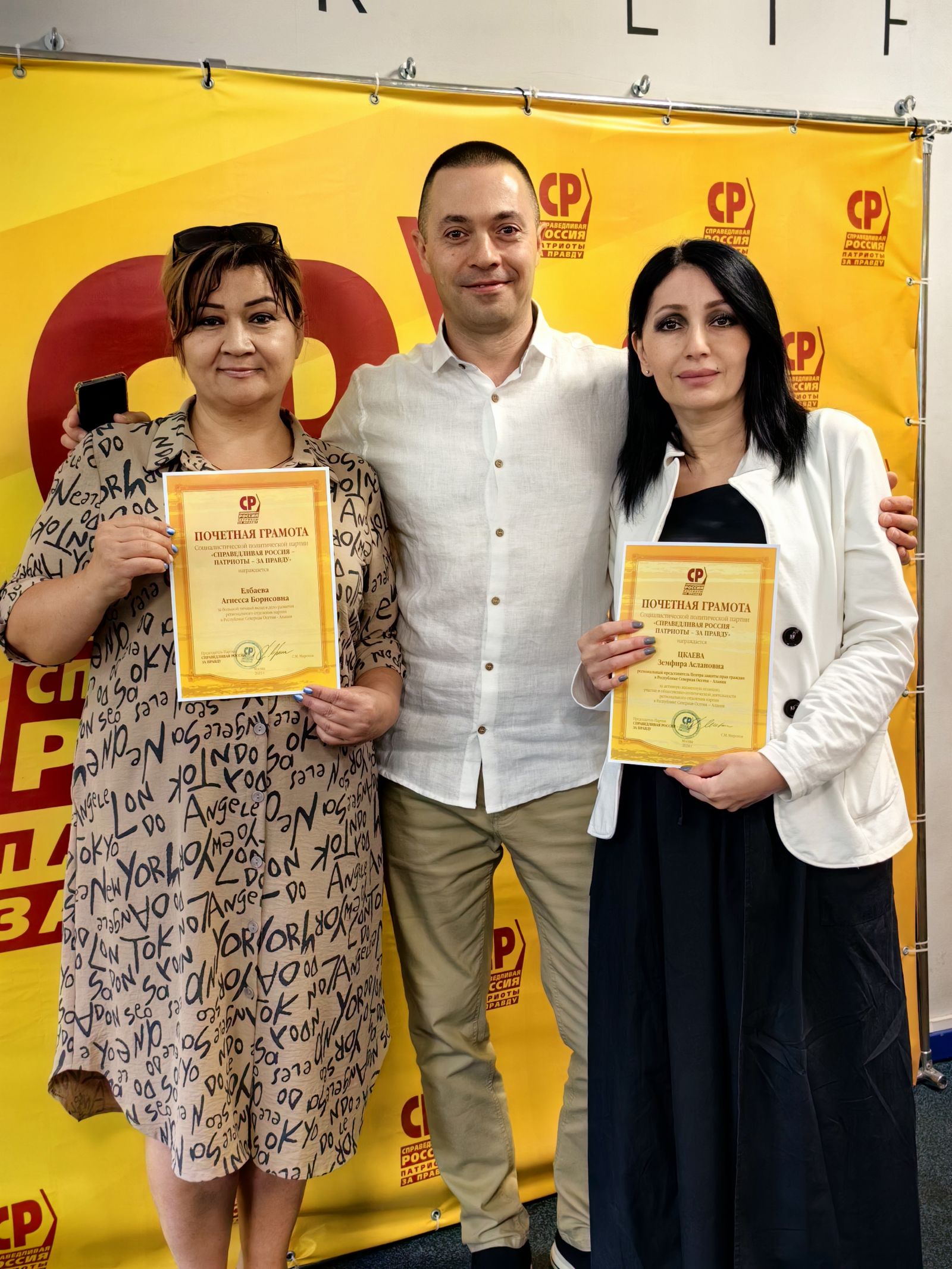 За большой личный вклад в повышение авторитета политической партии "СПРАВЕДЛИВАЯ РОССИЯ", высокую гражданскую ответственность, активную общественную деятельность были отмечены Наталья Михайленко, Рита Кудзоева, Земфира Цкаевой, Сослан Дидаров и Агнесса Елбаева.