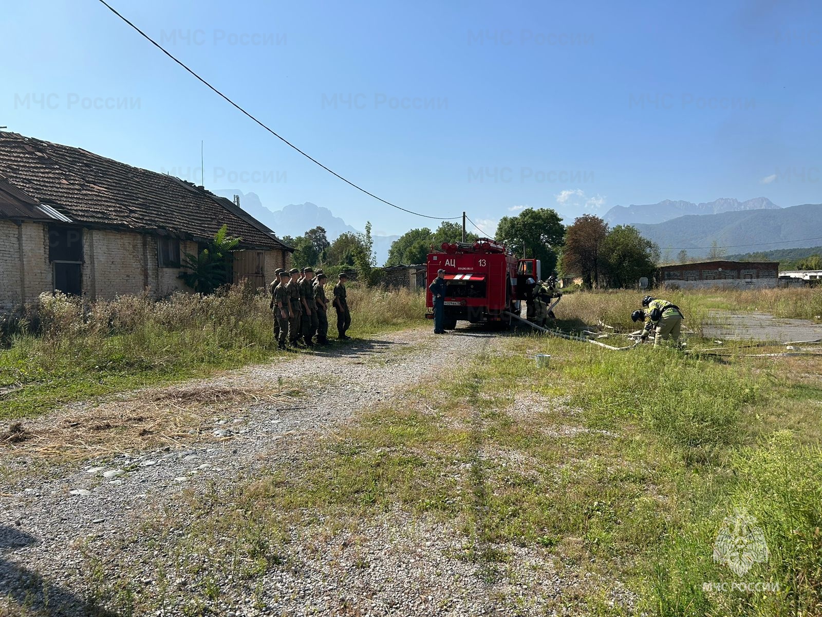На базе 58-й армии прошло пожарно-тактическое занятие. По легенде в здании сработала пожарная сигнализация, в одном из кабинетов произошло возгорание.