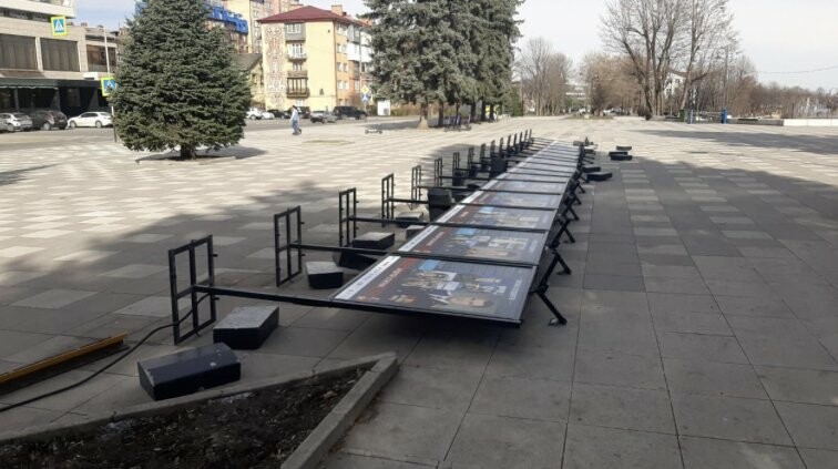 Восстановлены опрокинутые ветром выставочные стенды с фотографиями на площади перед гостиницей Владикавказ. Продолжается уборка улиц города от нанесенного мусора.