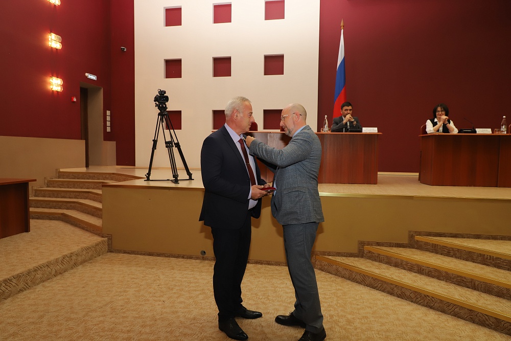 Перед началом заседания была вручена памятная медаль «Владикавказ – город воинской славы» префекту Промышленного района Годердзи Габараеву.