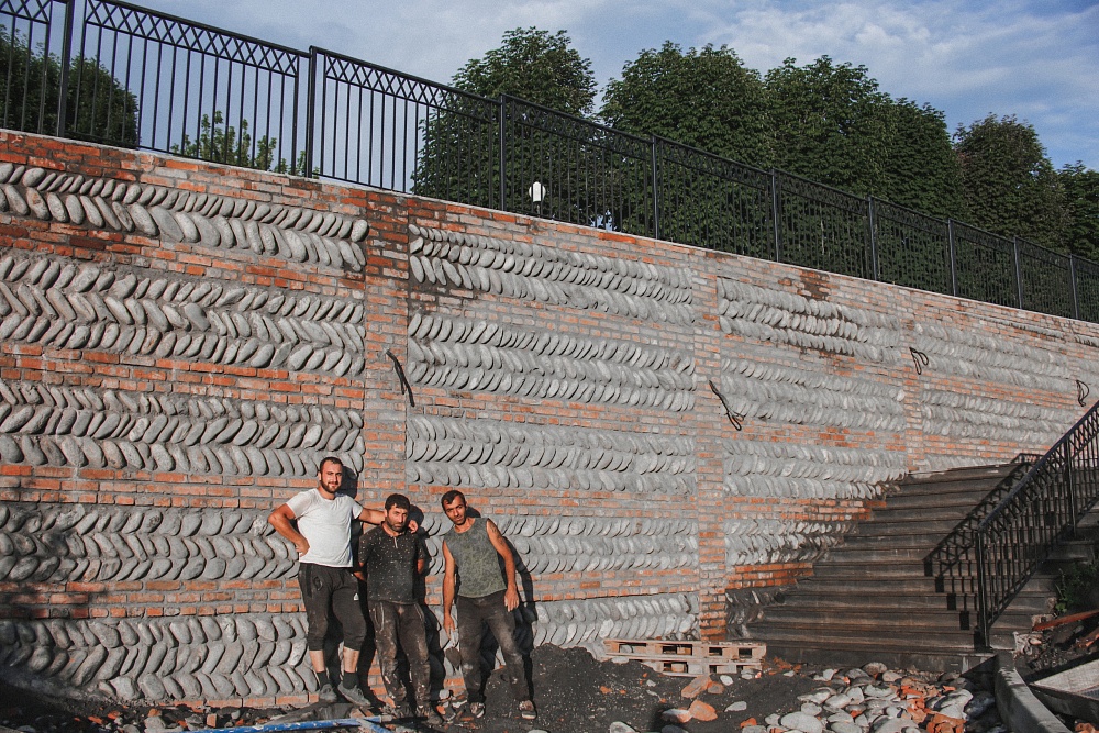 Завершились работы по облицовке подпорной стены по улице Чермена Баева. Стена площадью 100 м² выложена бутовым камнем с кирпичными вставками.