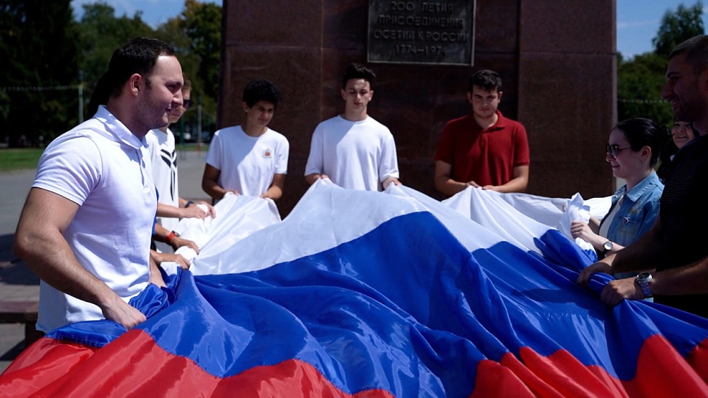 Во Владикавказе развернули десятиметровый флаг России.