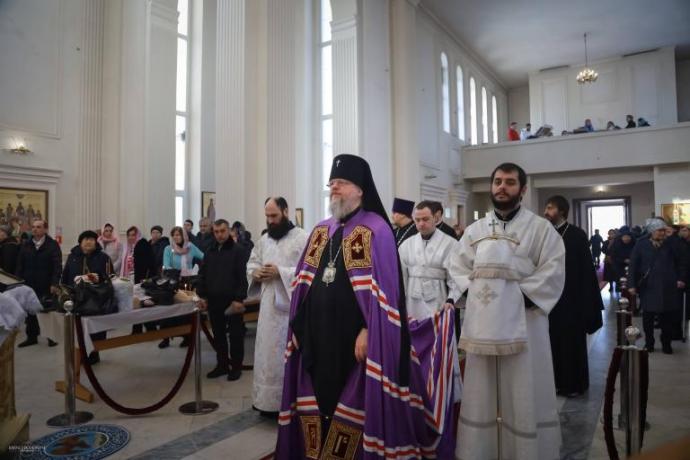 Правящему архиерею сослужили: секретарь епархии иерей Рустик Фенченко, ключарь собора иерей Георгий Дзеранов, клирики кафедрального собора.