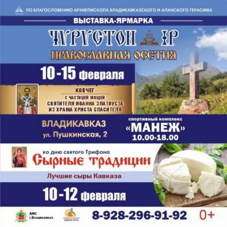 С 10 по 15 февраля 2023 года, в городе Владикавказе в СК «Манеж», по благословению Святейшего Патриарха Московского и всея Руси Кирилла начнет свою работу православная книжная выставка-форум «Радость Слова» и по благословению архиепископа Владикавказского и Аланского Герасима ко Дню святого Трифона состоится православная выставка-ярмарка «Чырыстон ИР. Православная Осетия».