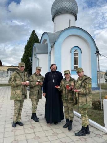 В Пятницу Светлой седмицы, в день, когда молитвенно чтится образ Пресвятой Богородицы «ЖИВОНОСНЫЙ ИСТОЧНИК», настоятель храма Архистратига Божия Михаила ст. Луковской, священник Андрей Раснянский, совершил молебное пение в Войсковой Части 3737, Национальной Гвардии РФ. По окончании молельного пения, духовник В/Ч передал пасхальные гостинцы для военнослужащих и рассказал о Празднике Пасхи Христовой.