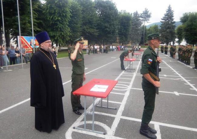 После обращения и поздравления командира бригады, с напутственными словами обратился помощник командира бригады управления армии по работе с верующими военнослужащими протоиерей Тимофей Остаев, который в частности сказал: «Поздравляю вас с принятием воинской присяги. Очень важным и волнующим моментом вашей жизни. Сегодня произнося слова присяги вы клялись, свято соблюдать Конституцию Российской Федерации в тексте которой говорится что «Российская Федерация, объединенная тысячелетней историей, сохраняет память предков, передавших нам идеалы и веру в Бога. И вот сегодня кто-то из вас присутствовал и молился за Божественной Литургией, тем самым доказывая преемственность нашей российской армии, как армии верующей, о которой говорили такие великие, русские, верующие полководцы как Дмитрий Донской, Александр Суворов, Феодор Ушаков.