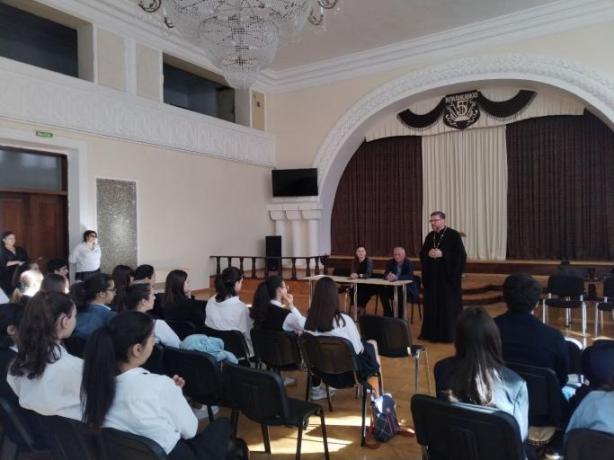 В обеих встречах по просьбе сотрудников МВД принял участие председатель Отдела Владикавказской епархии по взаимодействию с правоохранительными органами иерей Димитрий Кондратьев. Священник рассказал школьникам об отношении Русской Православной Церкви к вопросам межрелигиозных и межнациональных отношений, призвал учащихся с неизменным уважением относиться к представителям различных этносов и конфессий и напомнил о необходимости постоянного гармоничного духовно-нравственного, интеллектуального и культурного совершенствования каждой личности как эффективного фактора идейного противодействия экстремизму и терроризму.