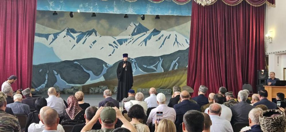 По благословению архиепископа Владикавказского и Аланского Герасима с приветственным словом ко всем собравшимся обратился руководитель епархиального отдела по взаимодействию с Вооружёнными силами и казачеством иерей Василий Грибенченко.