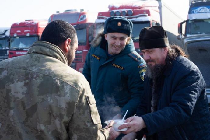 Сегодня, 10 февраля, председатель отдела по социальному служению и благотворительности Владикавказской и аланской епархии протоиерей Леонид Болтенков с сотрудниками выехали на стоянку, где припаркованы сотни грузовых фур. Вместе с сотрудниками МЧС о. Леонид кормил горячим обедом водителей большегрузов из Турции, Армении, Грузии, Белоруссии и Казахстана.