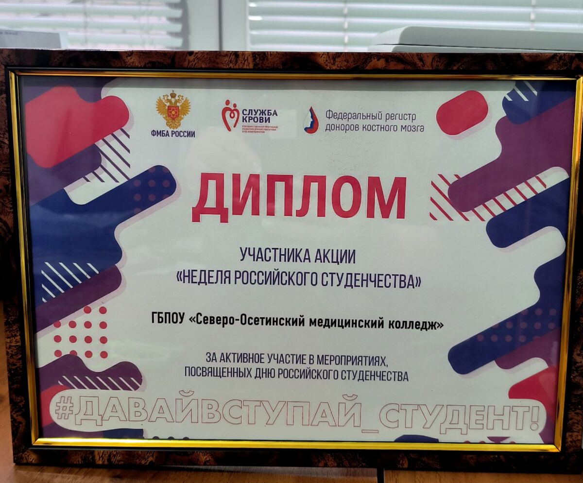 За активное участие в мероприятиях, посвященных Дню Российского студенчества, Северо-Осетинский медколледж награжден дипломом участника акции “Неделя Российского студенчества”. Диплом в торжественной обстановке директору колледжа Таймуразу Ревазову вручили менеджер по связям с общественностью Регина Томаева и врач-трансфузиолог Республиканской станции переливания крови Лариса Темесова.