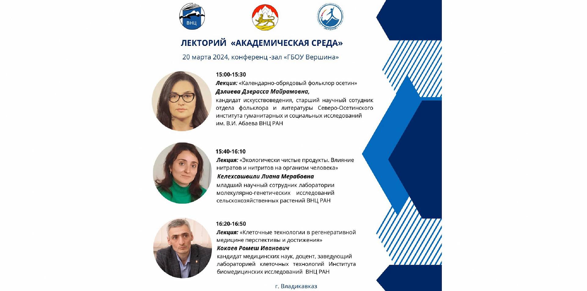 Лекторий ВНЦ РАН «Академическая среда» для учащихся 8-11 классов, который проходит на базе Республиканского центра выявления, поддержки и развития способностей и талантов детей и молодежи «Вершина», набирает популярность среди учащейся молодежи. В ходе очередной, четвертой сессии, лектория, прошедшей 20 марта, говорили о календарно-обрядовом фольклоре осетин, обсуждали, что необходимо человеку для гармоничной жизни - жить в экологически благоприятной среде, есть здоровую пищу без нитратов и нитритов, узнали много нового о клеточных технологиях и их использовании в регенеративной медицине.